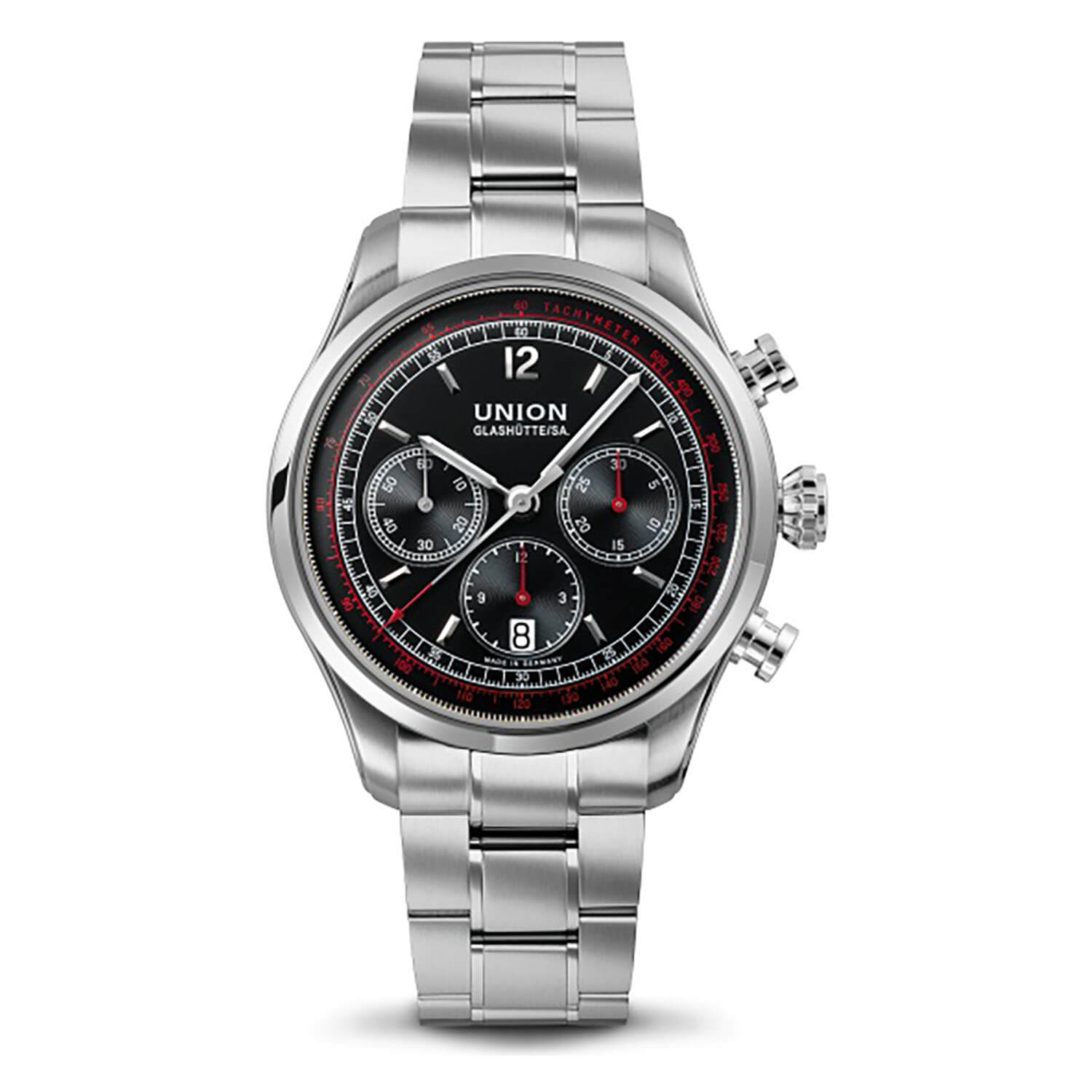| Funktionen | Stunden, Minuten, kleine Sekunde, Datumsanzeige im Zifferblattfenster, Datumskorrektur durch Drücker bei 10 Uhr, Chronograph 60 Sekunden, 30-Minuten- und 12 Stunden-Zähler, Sekundenstopp |