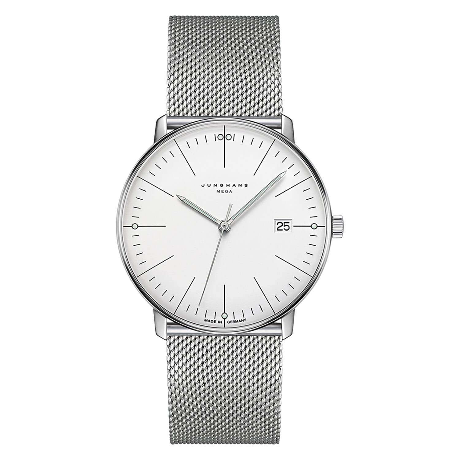 | Funktionen | Datum, komfortable Zeiteinstellung per Krone oder über die Junghans MEGA App, präzise Sekundenanzeige in Halbsekundenschritten |