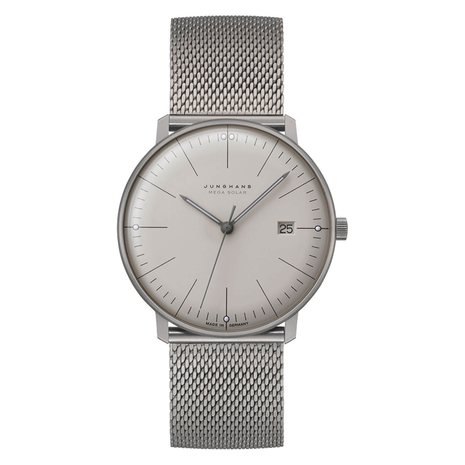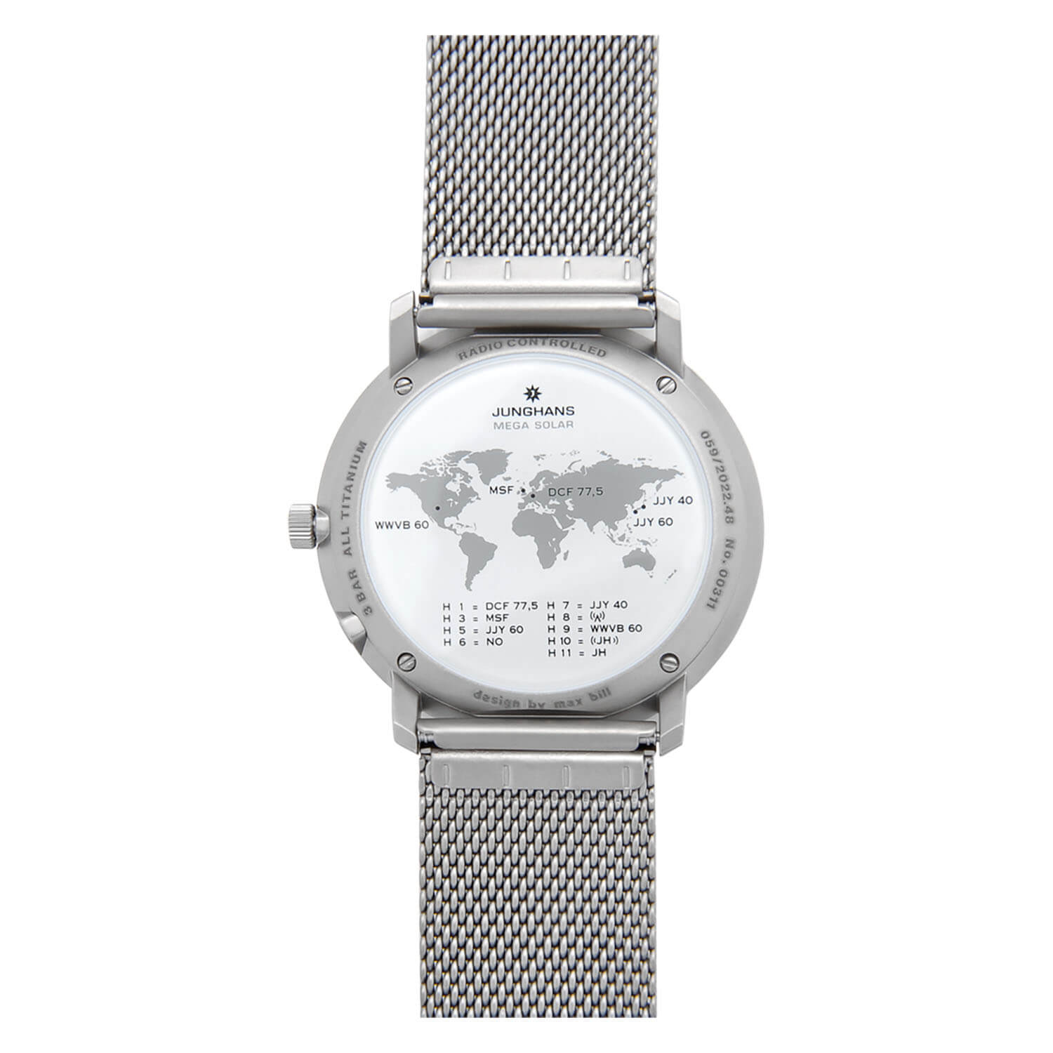 max bill MEGA Solar – Ihr minimalistisches Design bleibt immer modern, ihre Energie schöpft sie aus der Sonne. Dank des Materials Titan erlebt man die Uhr als verblüffend leicht und besonders hautfreundlich. Weiteren Komfort bieten das hochmoderne Funkwerk, ein ewiger Kalender und die einfache Einstellung der Zeitzonen per Krone oder in wenigen Sekunden mit dem Junghans eigenen Zeitsignal der Junghans MEGA App. Auch das Design der max bill MEGA Solar steht ganz im Zeichen der Nachhaltigkeit: Die Bauhaus-typische minimalistische Formensprache bleibt modern – gestern, heute, morgen und übermorgen.