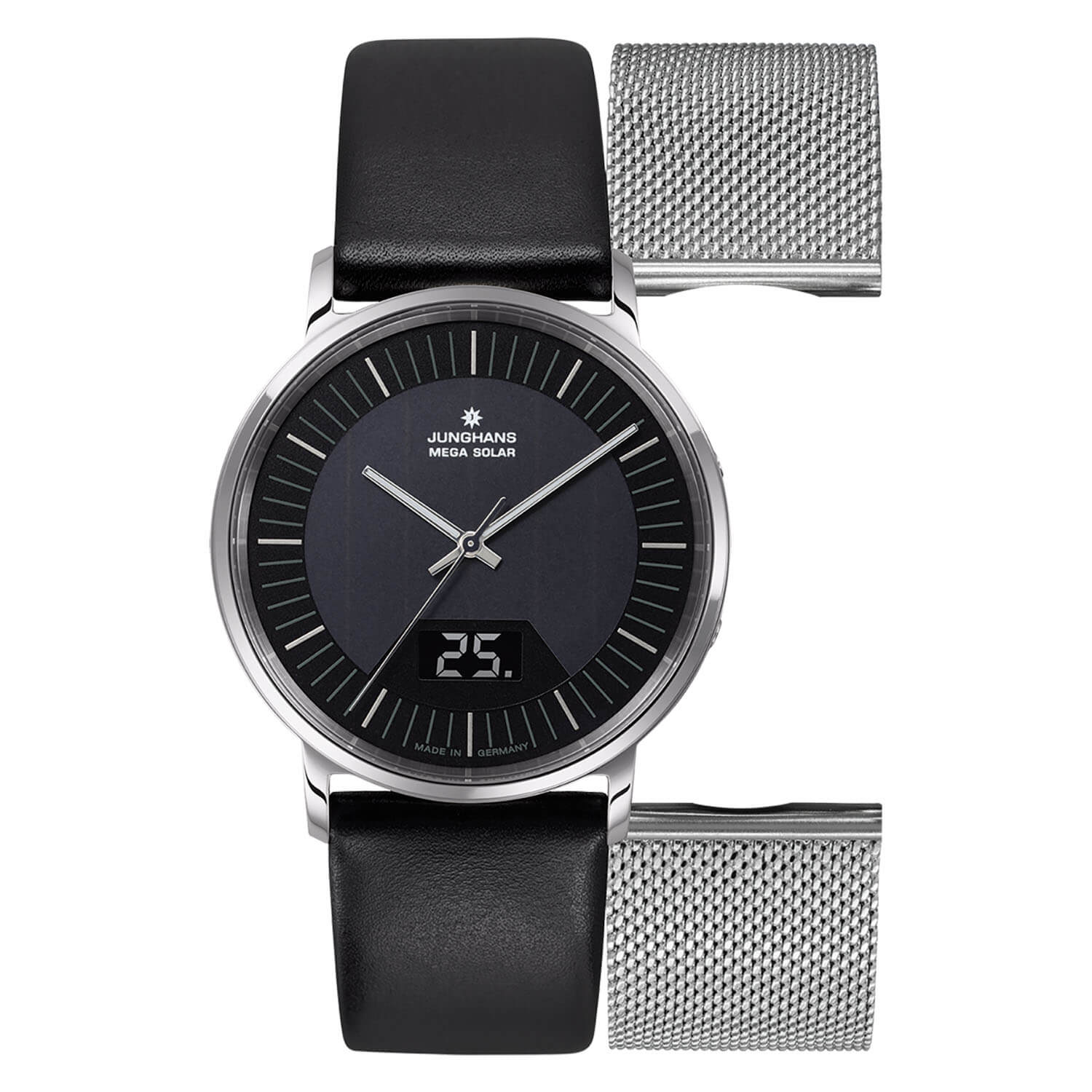| Funktionen | Dunkelgangreserve bis zu 21 Monaten, Sleepmode nach 72 Stunden, Großdatum, komfortable Zeiteinstellung über die Junghans MEGA App |